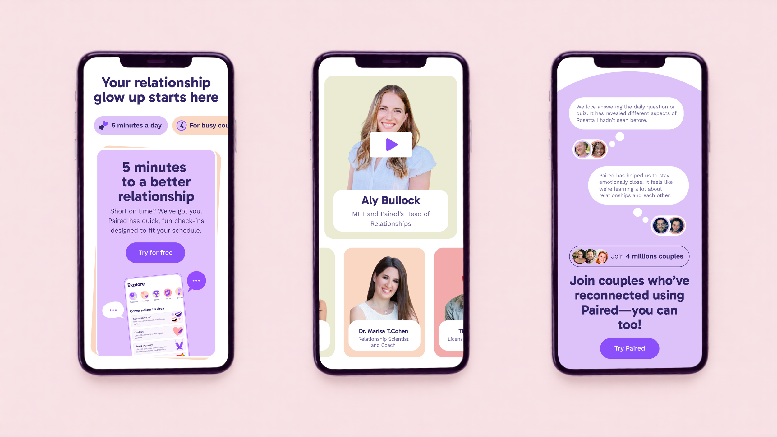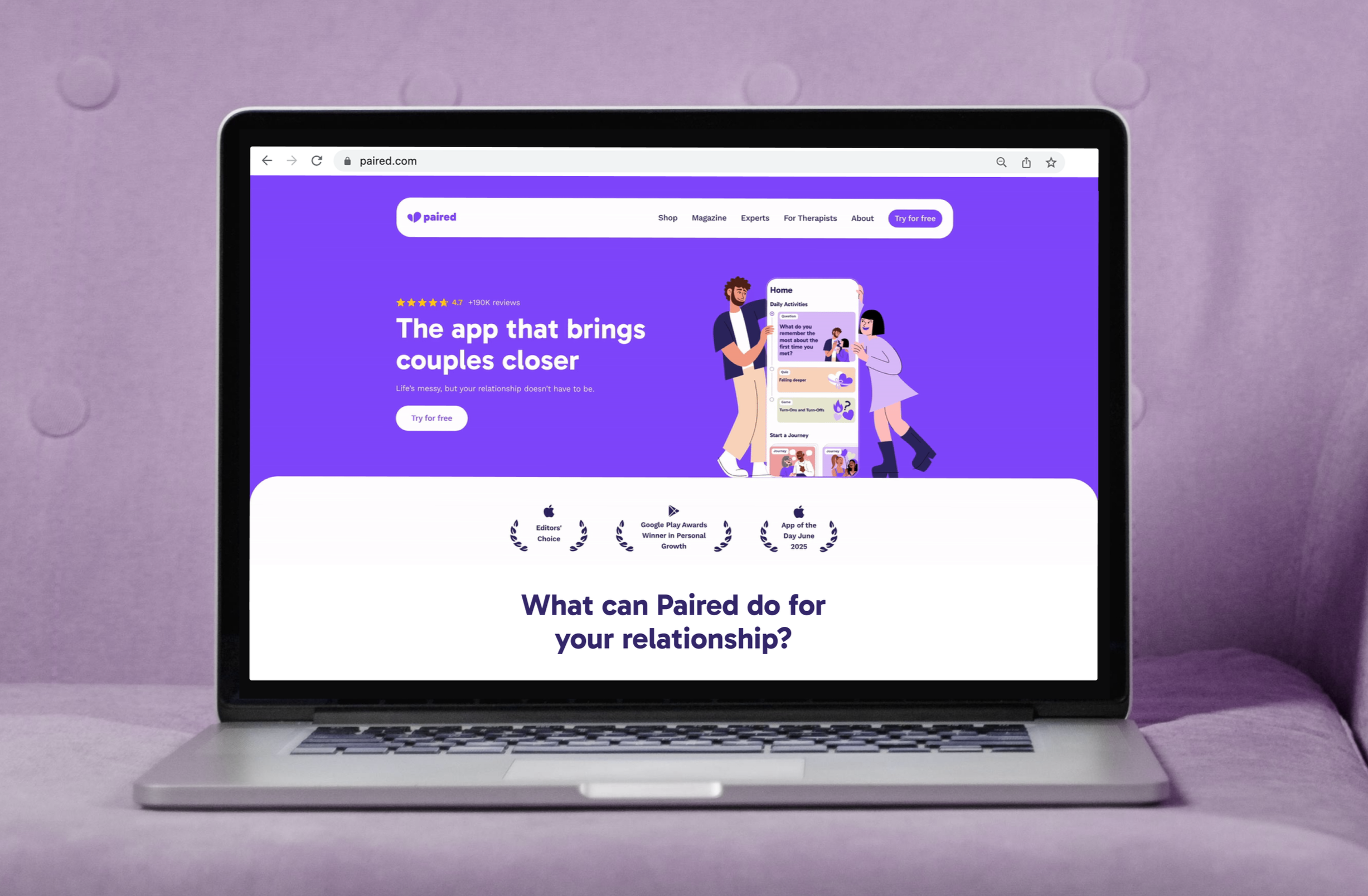 Working closely with Research and Product, I led a refresh focusing on ensuring consistency in tone, visuals, and brand messaging across the homepage. My work focused on anchoring the Paired story around key relationship stressors that resonated with users.